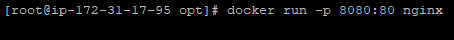 위의 커맨드는 이미지를 띄우되, 호스트의 8080 포트를 컨테이너의 80 포트에 붙이라는 의미이다. 현재 도커를 자신의 컴퓨터에 설치하여 저 커맨드를 실행하였다면, 브라우저를 띄운 후 호스트주소:8080을 입력해 보자. 그러면 엔진엑스 메인 화면이 나오는 것을 확인할 수 있을 것이다.